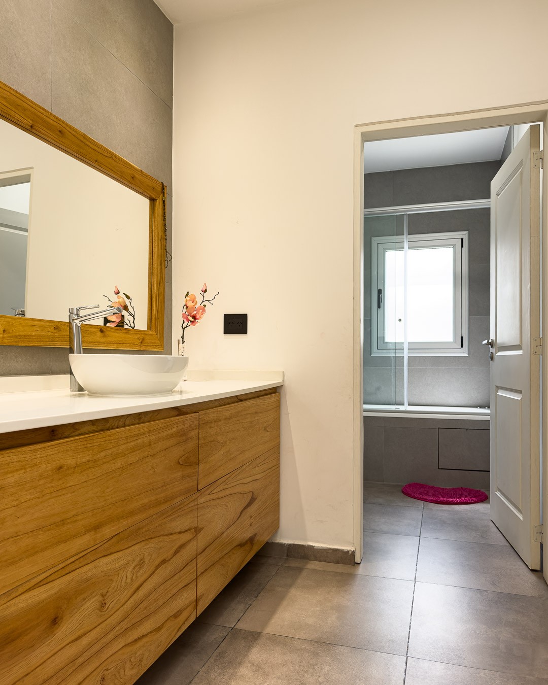 Los interiores, amplios y fluidos, combinan hormigón visto, muebles empotrados a medida y grandes aberturas de aluminio con DVH que permiten el ingreso generoso de luz natural. Los pisos de porcelanato simil madera acompañan la escena con calidez y sobriedad.